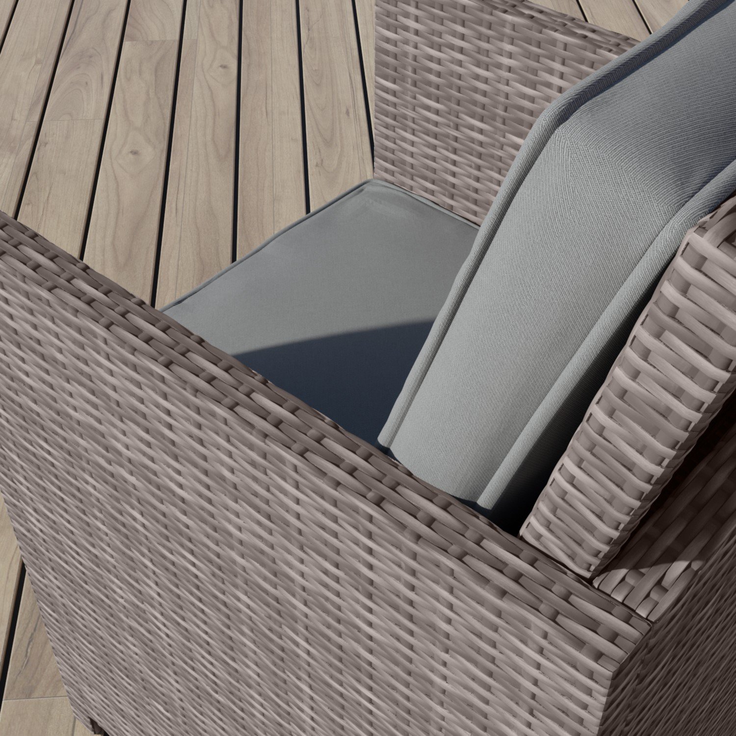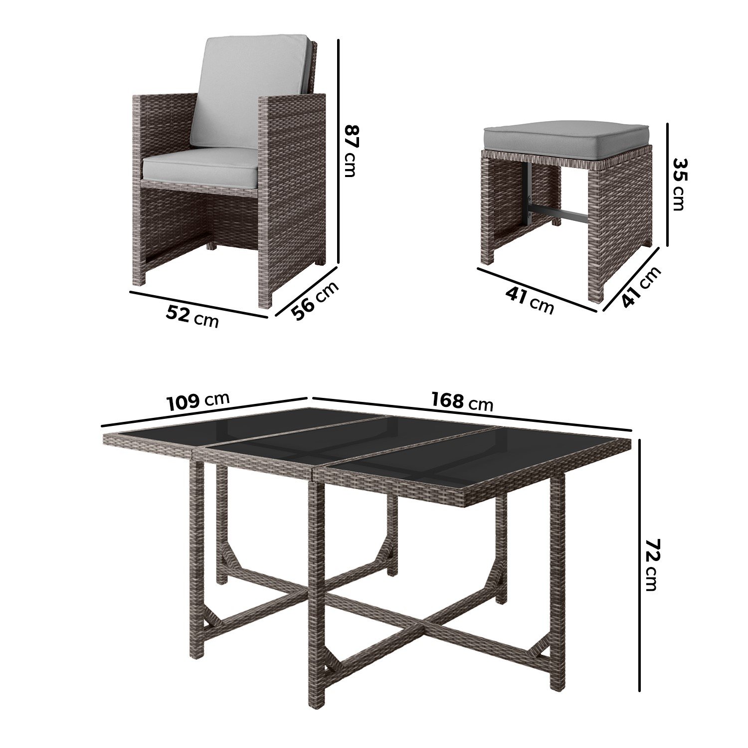 - Material: Synthetic woven rattan, powder coated steel (frames/table), fabric (upholstery), foam fill (cushions) and tempered glass (tabletop)