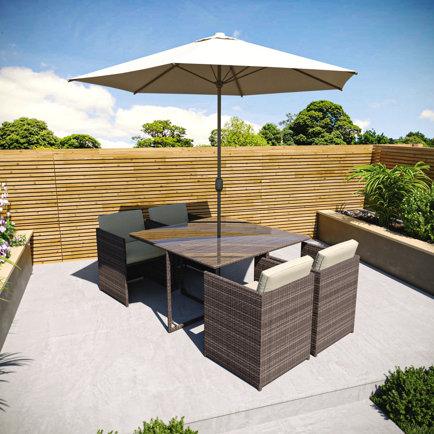 This summer, enjoy dining in your garden with our stylish four-seater cube dining set. The compact design allows it to be neatly packed away by tucking the chairs underneath the table. The parasol slots easily into the table’s central parasol hole and features an easy crank mechanism to offer shade and shelter from light showers. The set is made using UV resistant, waterproof rattan to create a durable addition to your garden. This dining set is designed for use outdoors. However, during winter, we recommend that you store it indoors or in a sheltered position like in one of our garden stores.