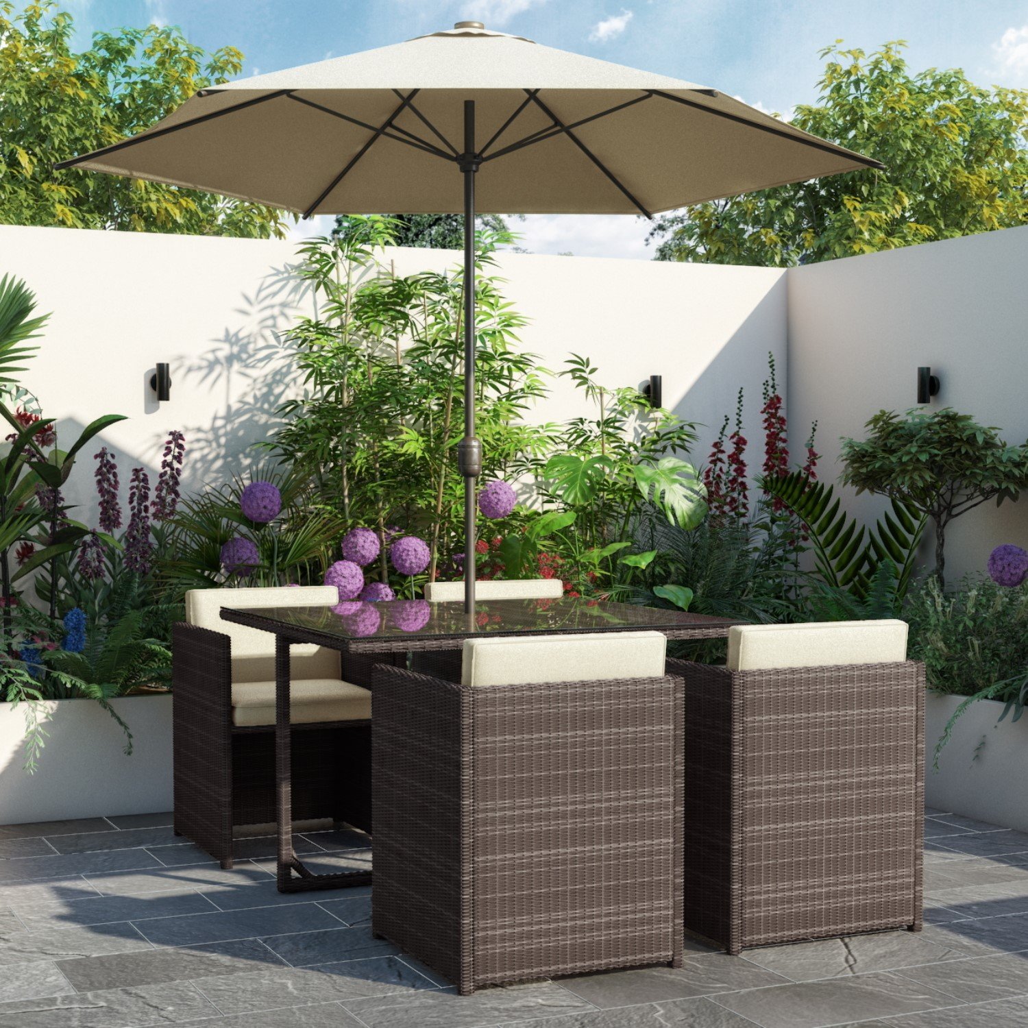 4 Seater Brown Rattan Cube Garden Dining Set – Parasol Included – Fortrose