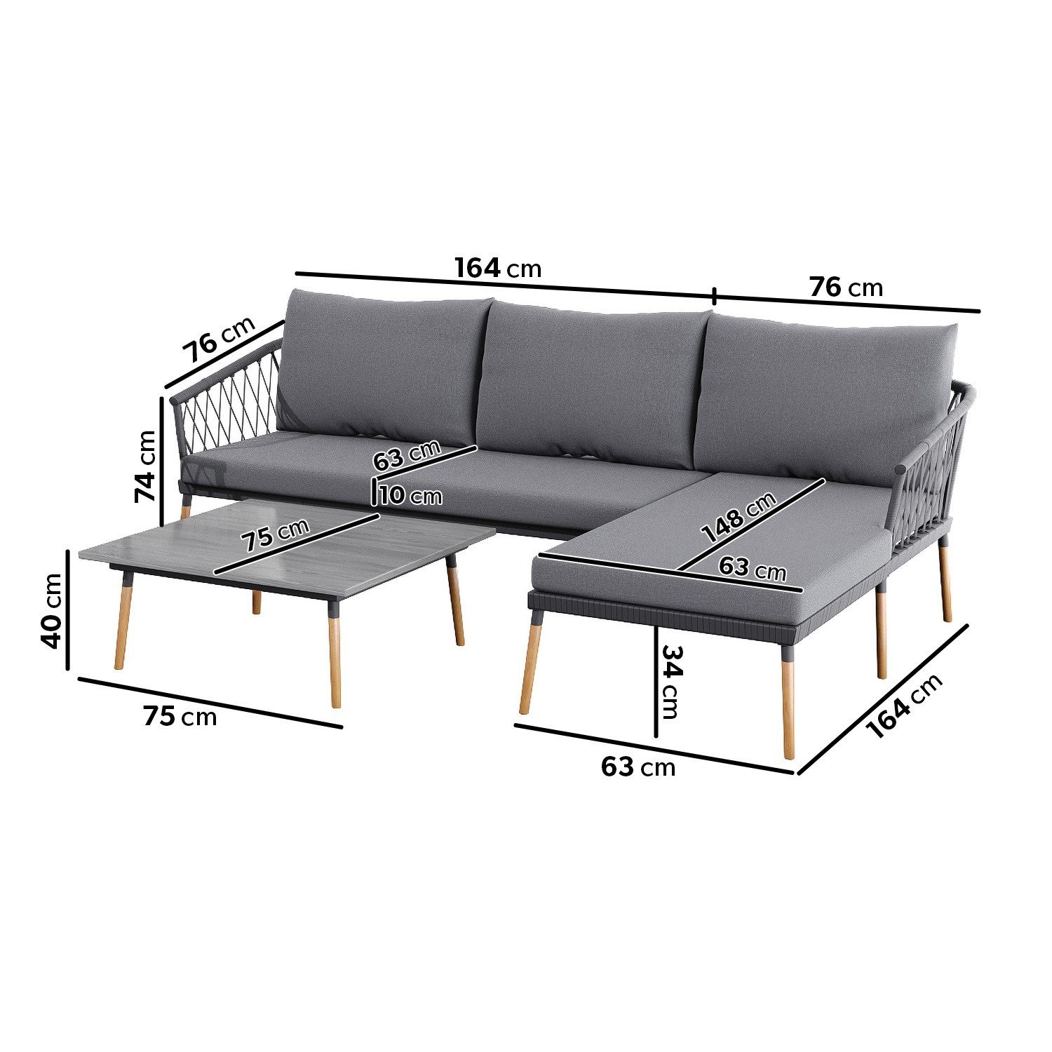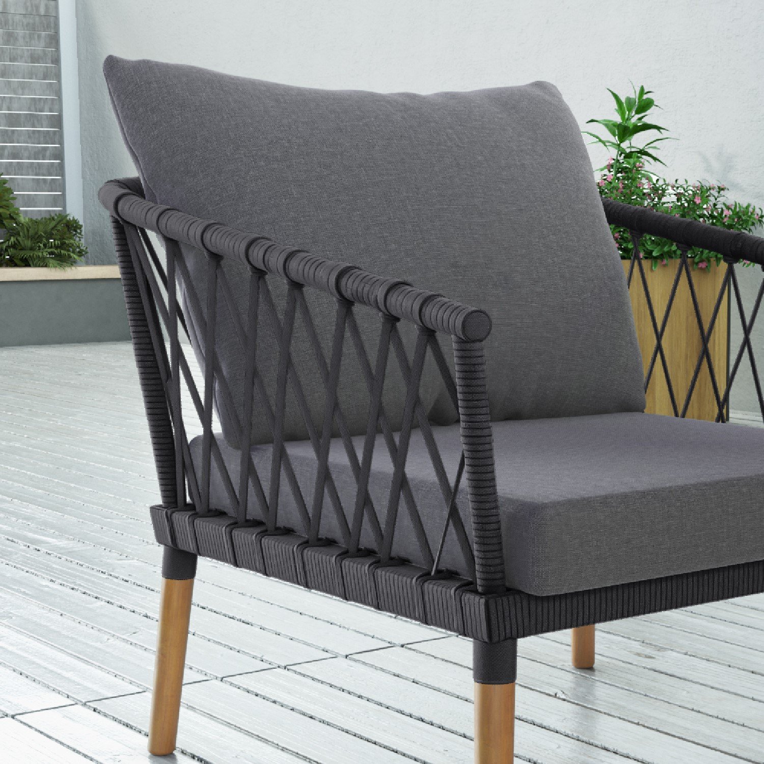 - Material: Rope, acacia wood (legs), aluminum (frame), 230g thick fabric (upholstery), non-foam and fibred fill (cushions)