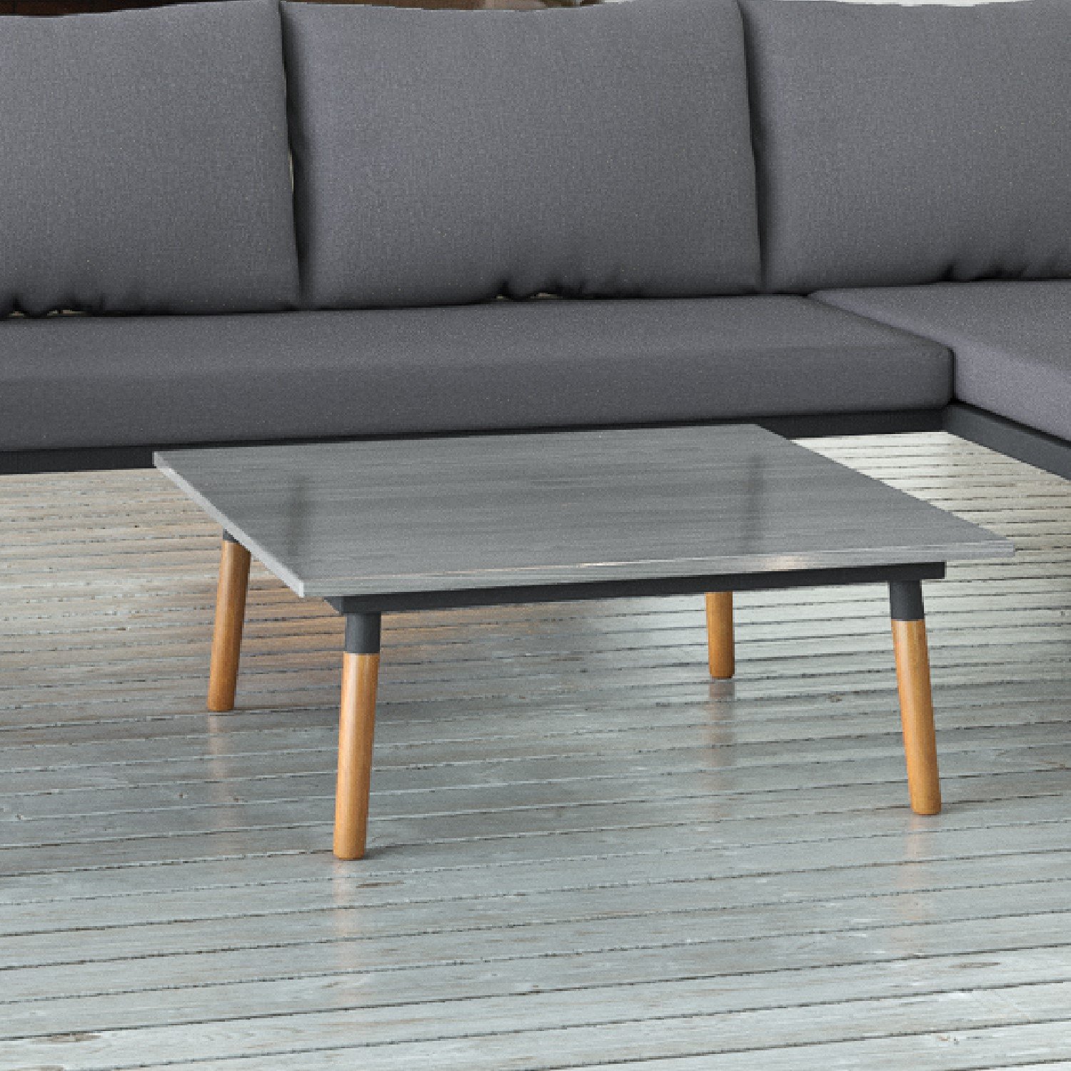 - Color: Dark grey and natural wood