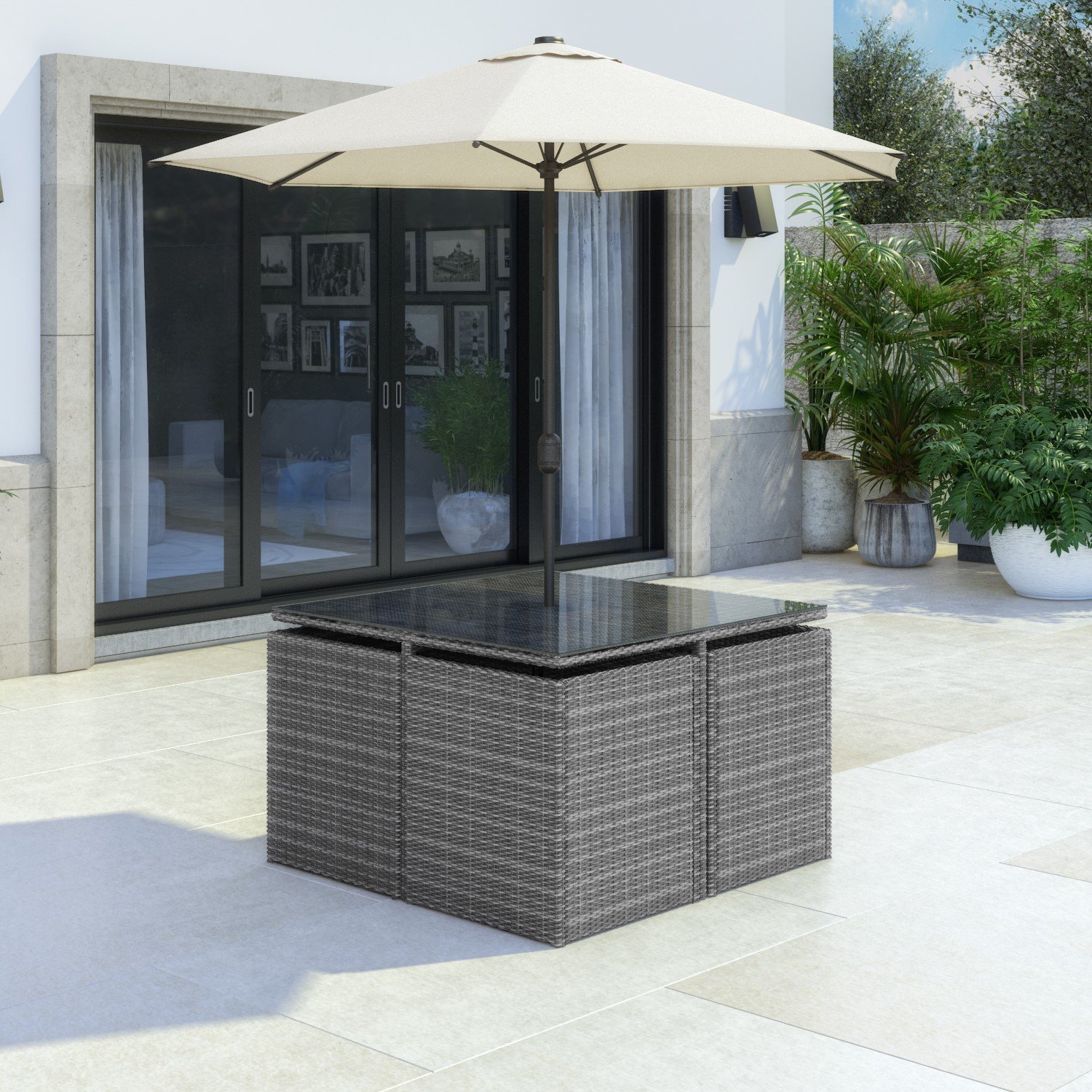 4 Seater Grey Rattan Cube Garden Dining Set – Parasol Included – Fortrose