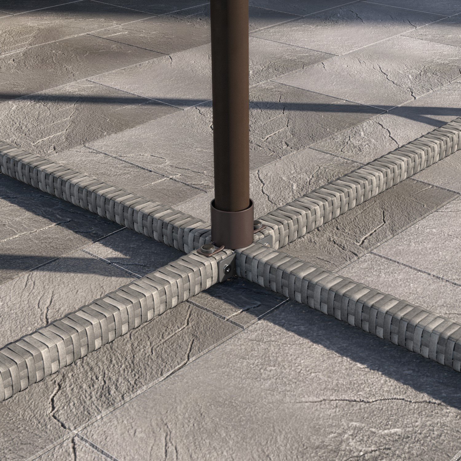 - Material: Clear, tempered glass (tabletop), synthetic rattan, fabric (cushions / parasol) and powder-coated steel (frames)