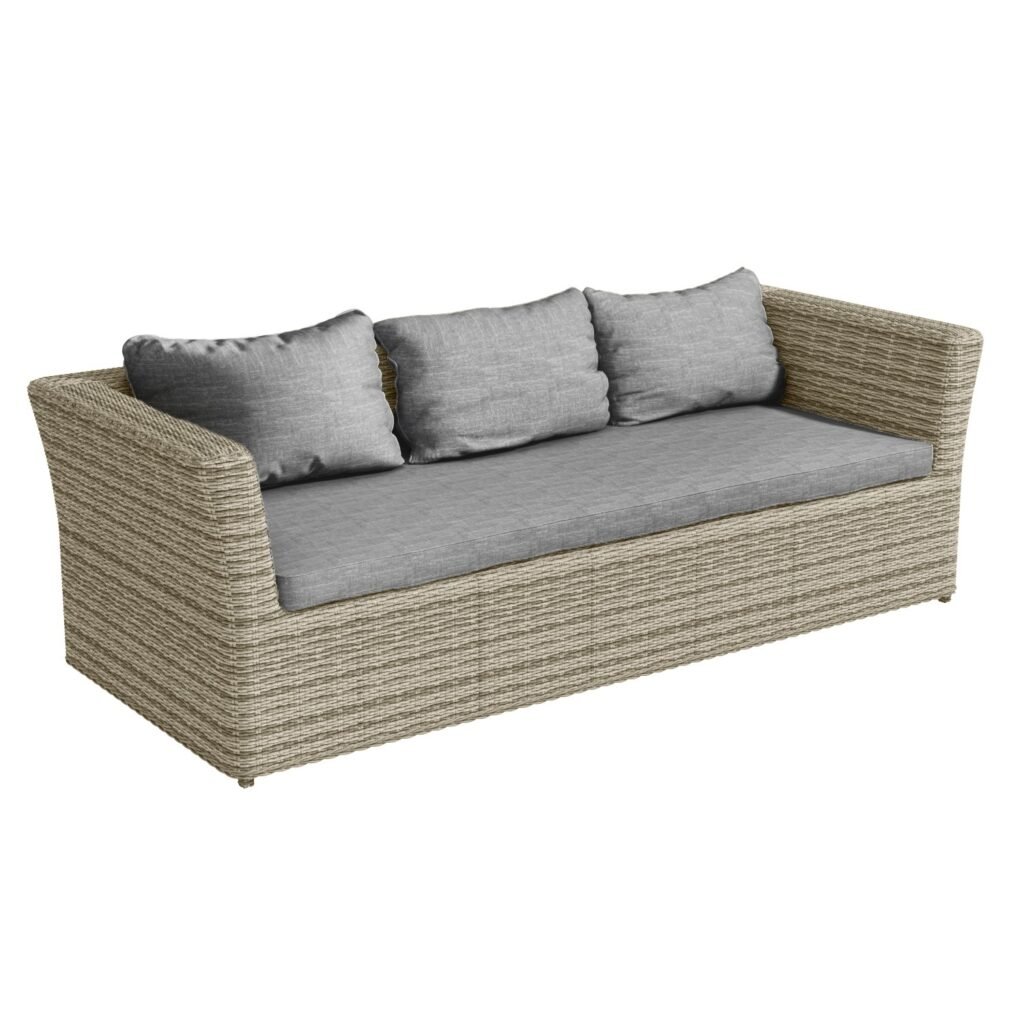 - Finish: Woven flat rattan, upholstery and powder coated metal (frames)