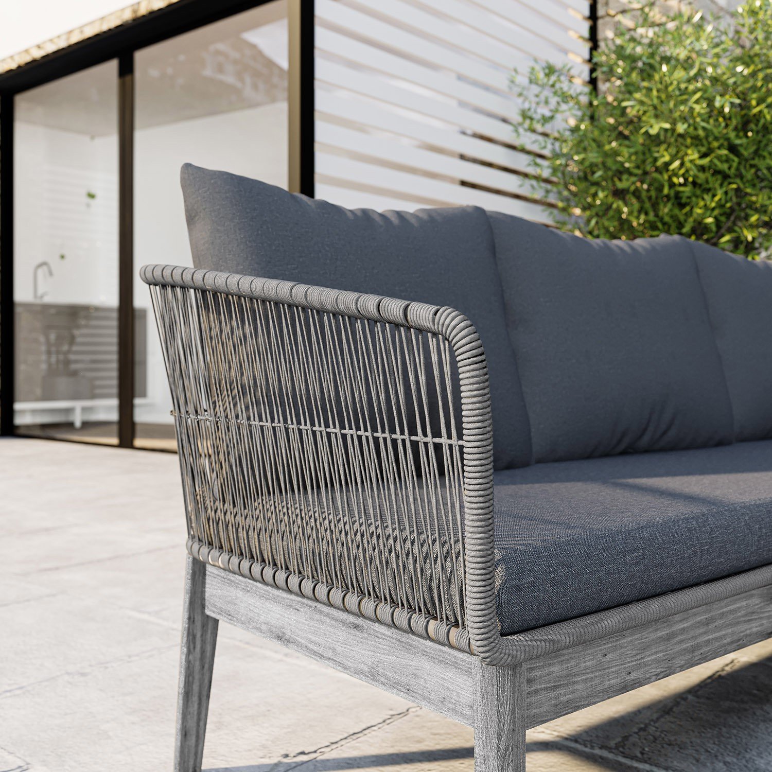 - Material: Rope, FSC acacia wood, aluminum (frame), 230g polyester spun fabric (upholstery), non-foam and fibred fill (cushions)