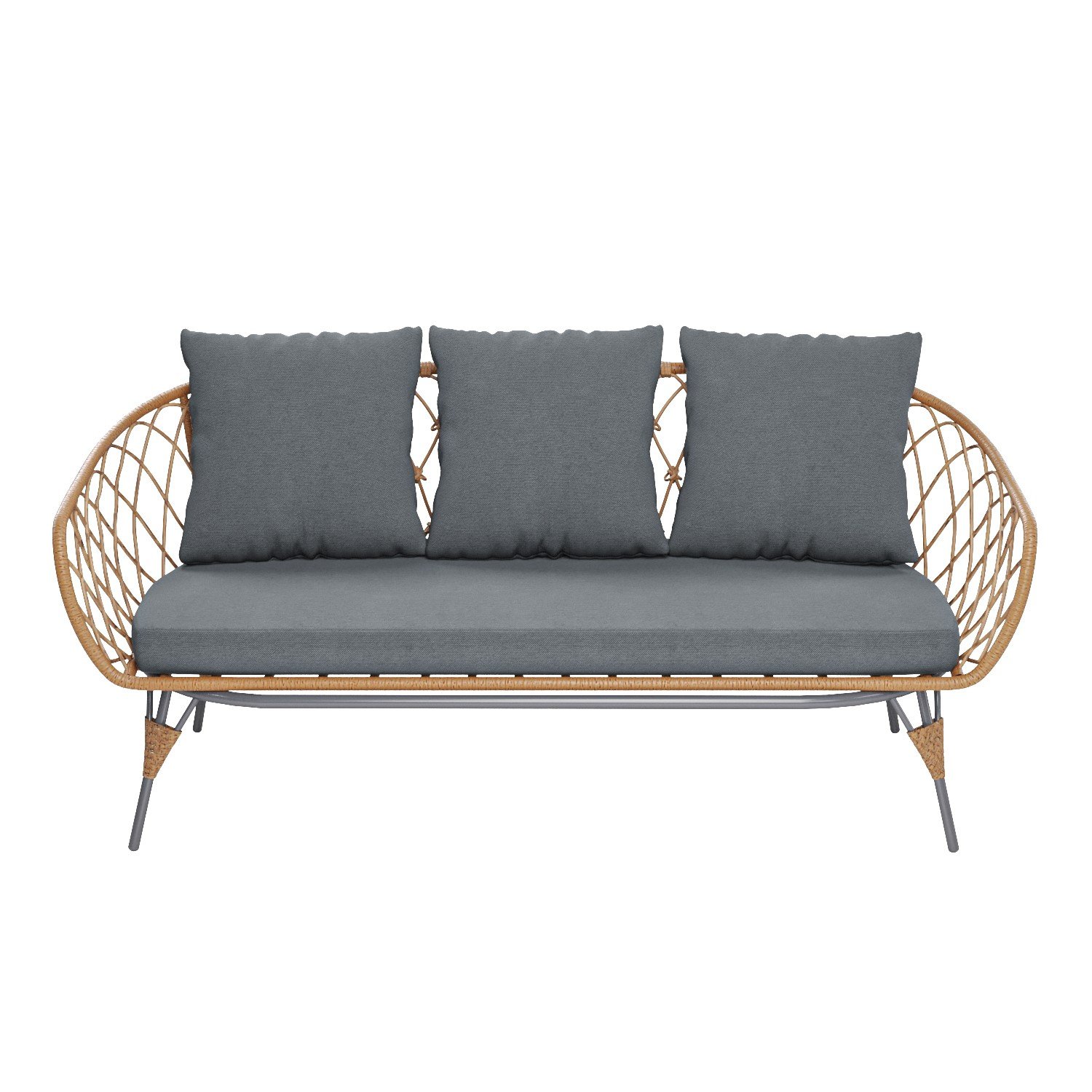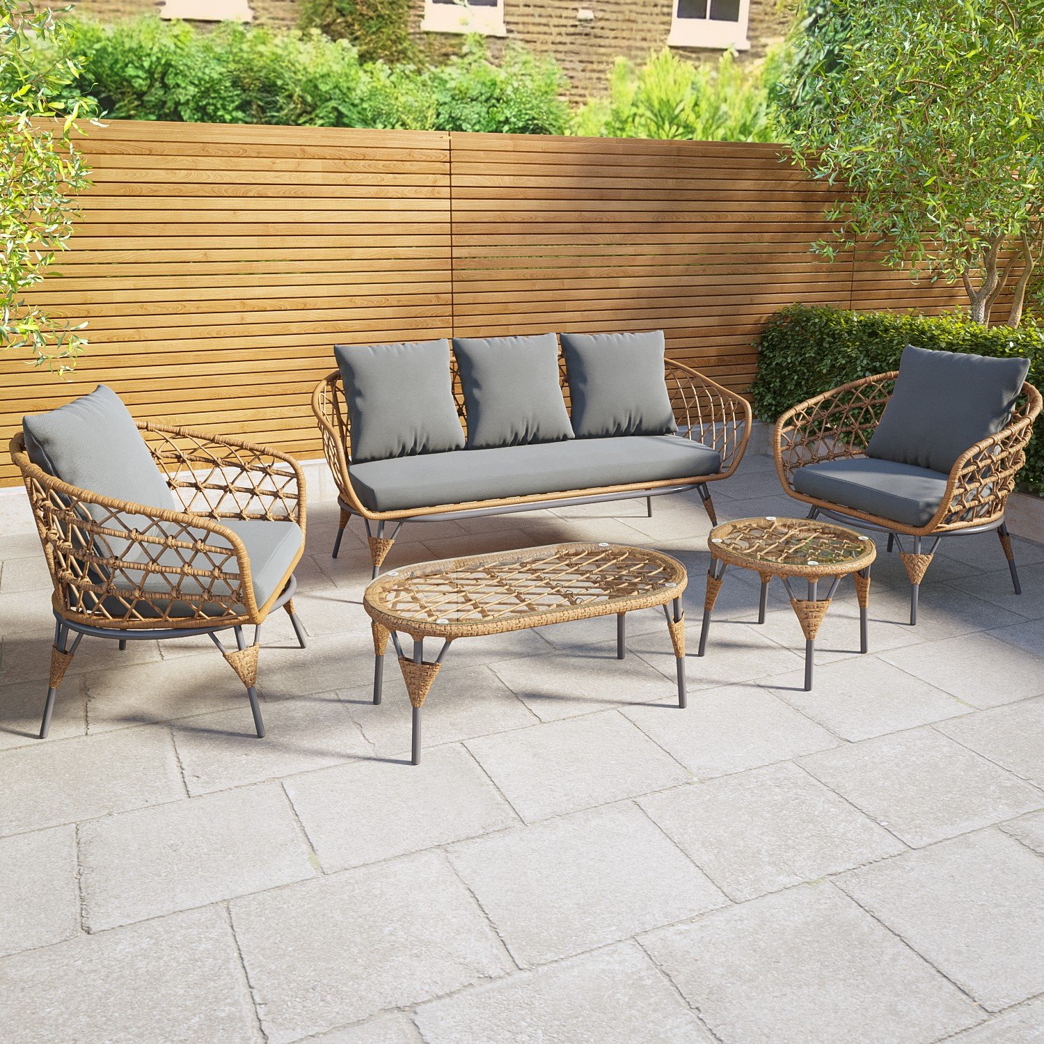 Enjoy outdoor entertaining with this stunning woven garden set. It comes with two deep chairs, a matching three-seater sofa, a coffee table, and a side table. It has been crafted from wicker, which has been woven and wrapped around the sturdy iron. This outdoor sofa set comes with stone-grey cushions that contrast with the natural warm wicker to create the perfect on-trend sofa set.