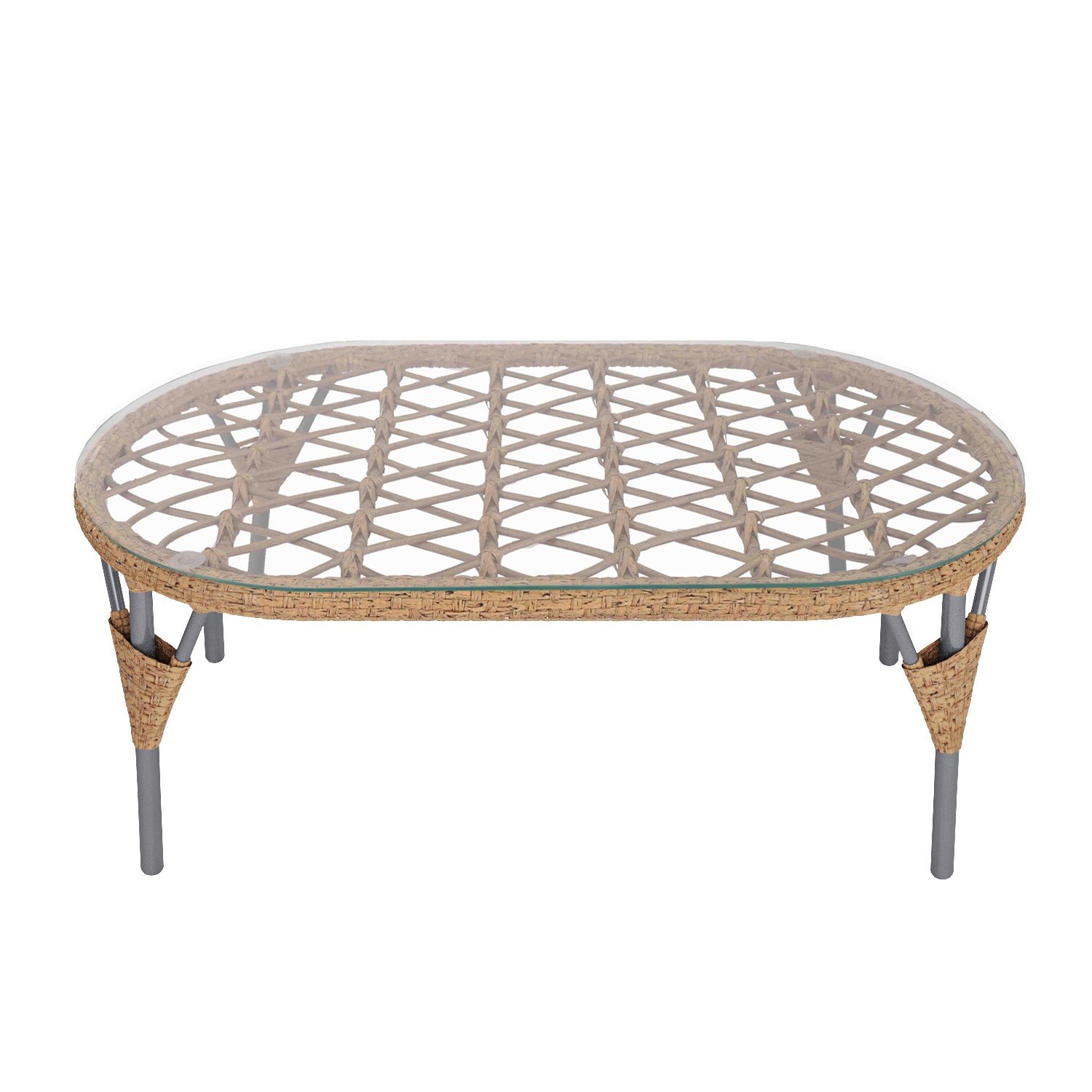 - Material: Synthetic woven wicker, powder coated iron (frames), fabric (upholstery), foam and silk floss fill (cushions) and tempered glass (tabletop)