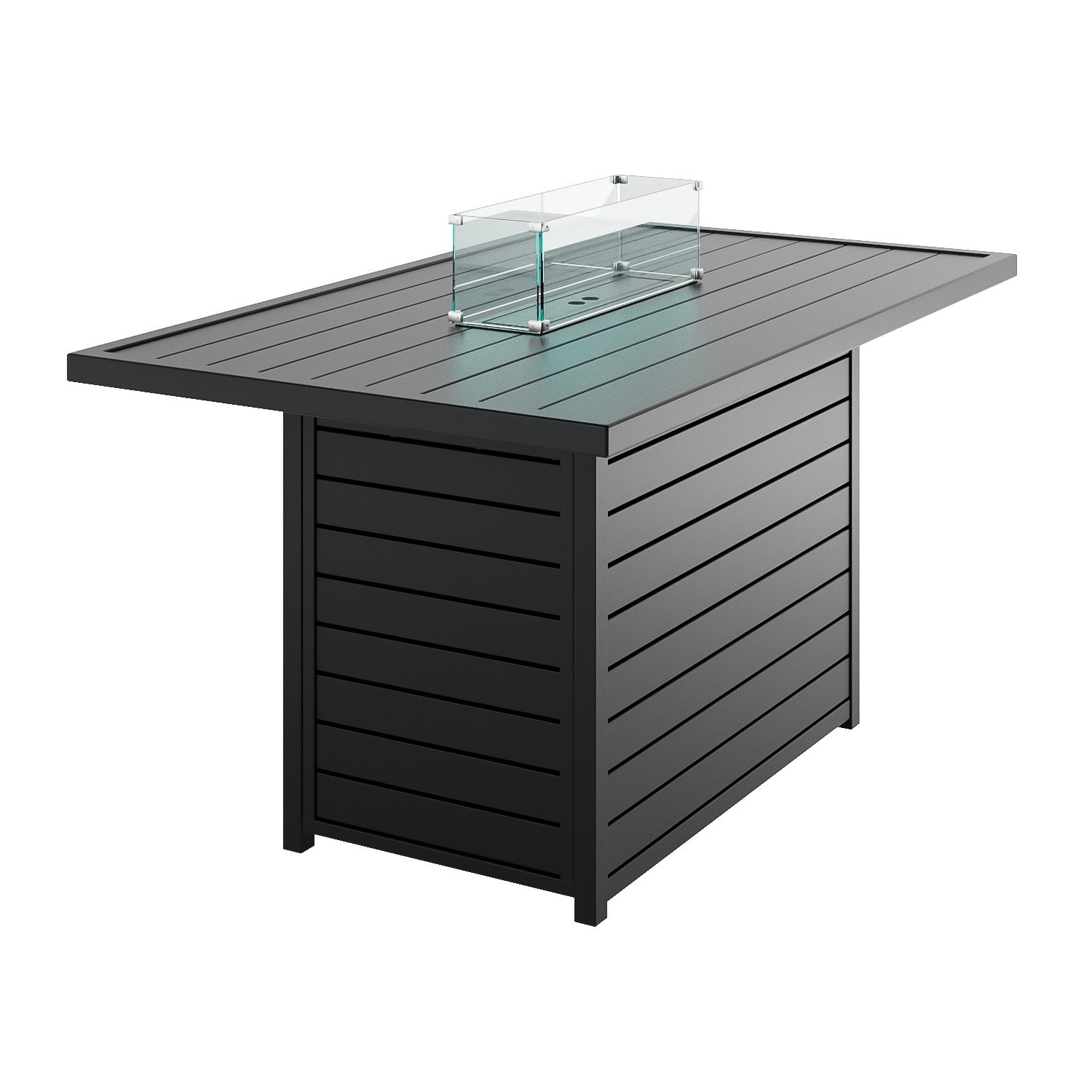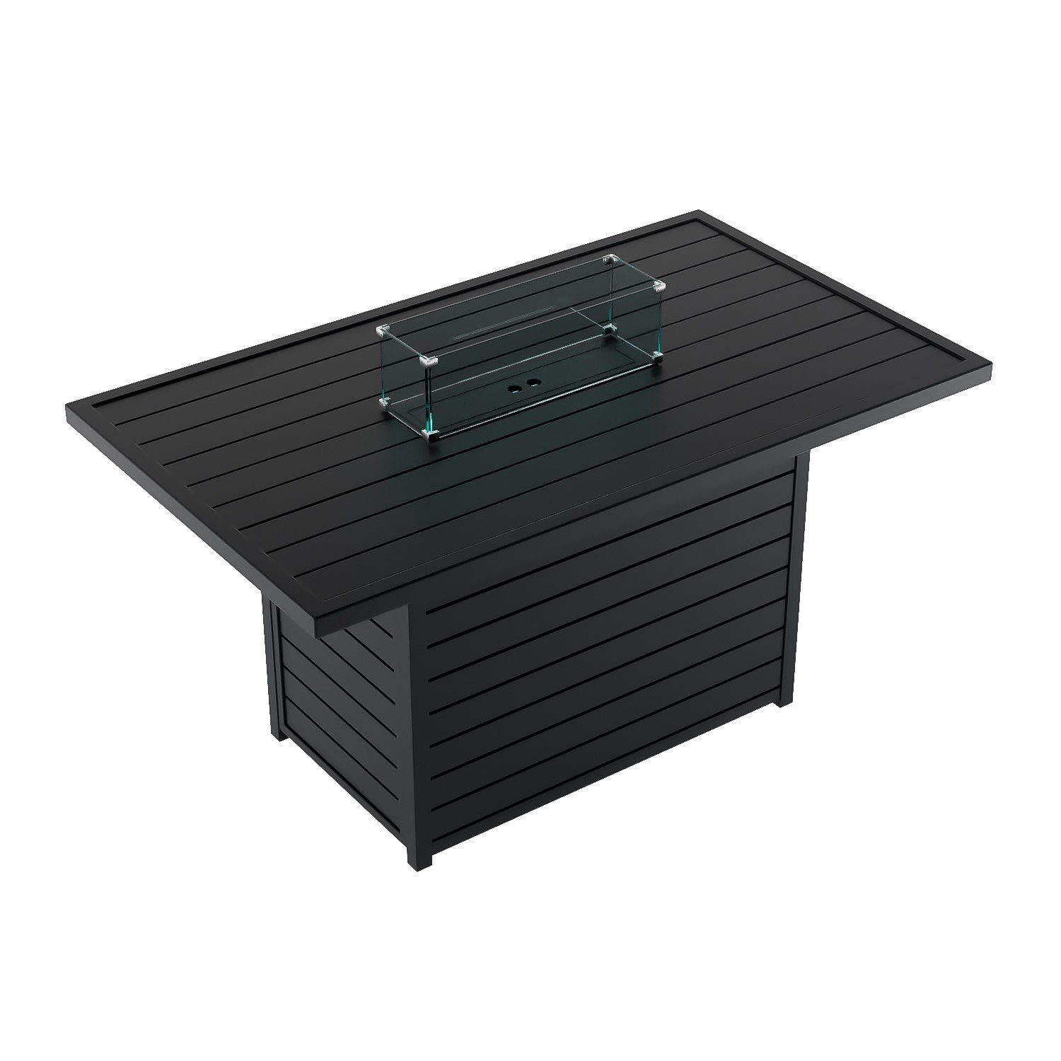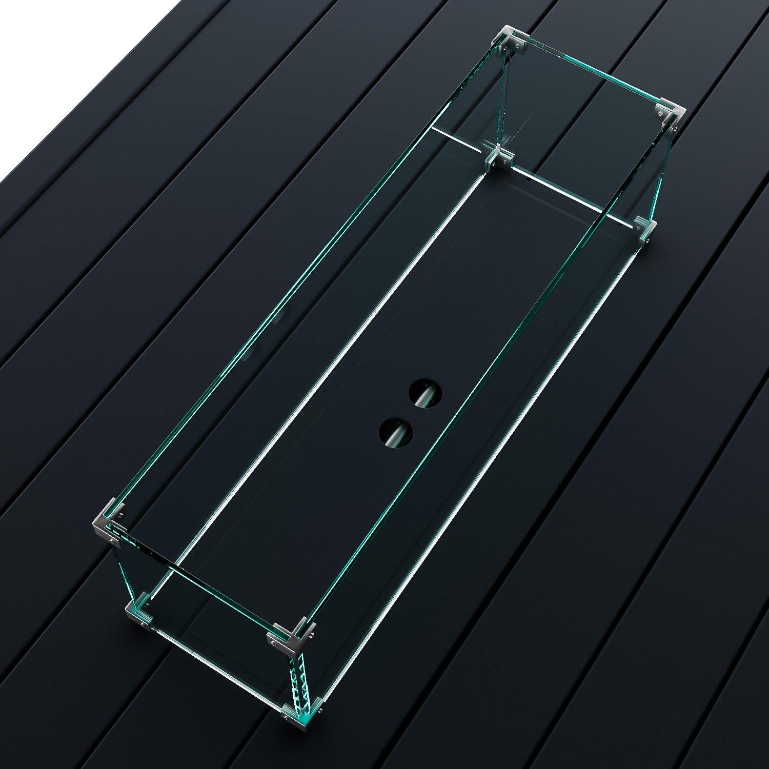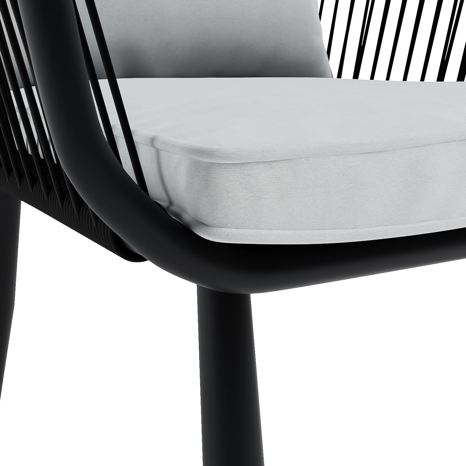 - Material: Synthetic woven rope, powder coated aluminum (frames/table), fabric (upholstery), foam fill (cushions) and glass (firepit surround)
