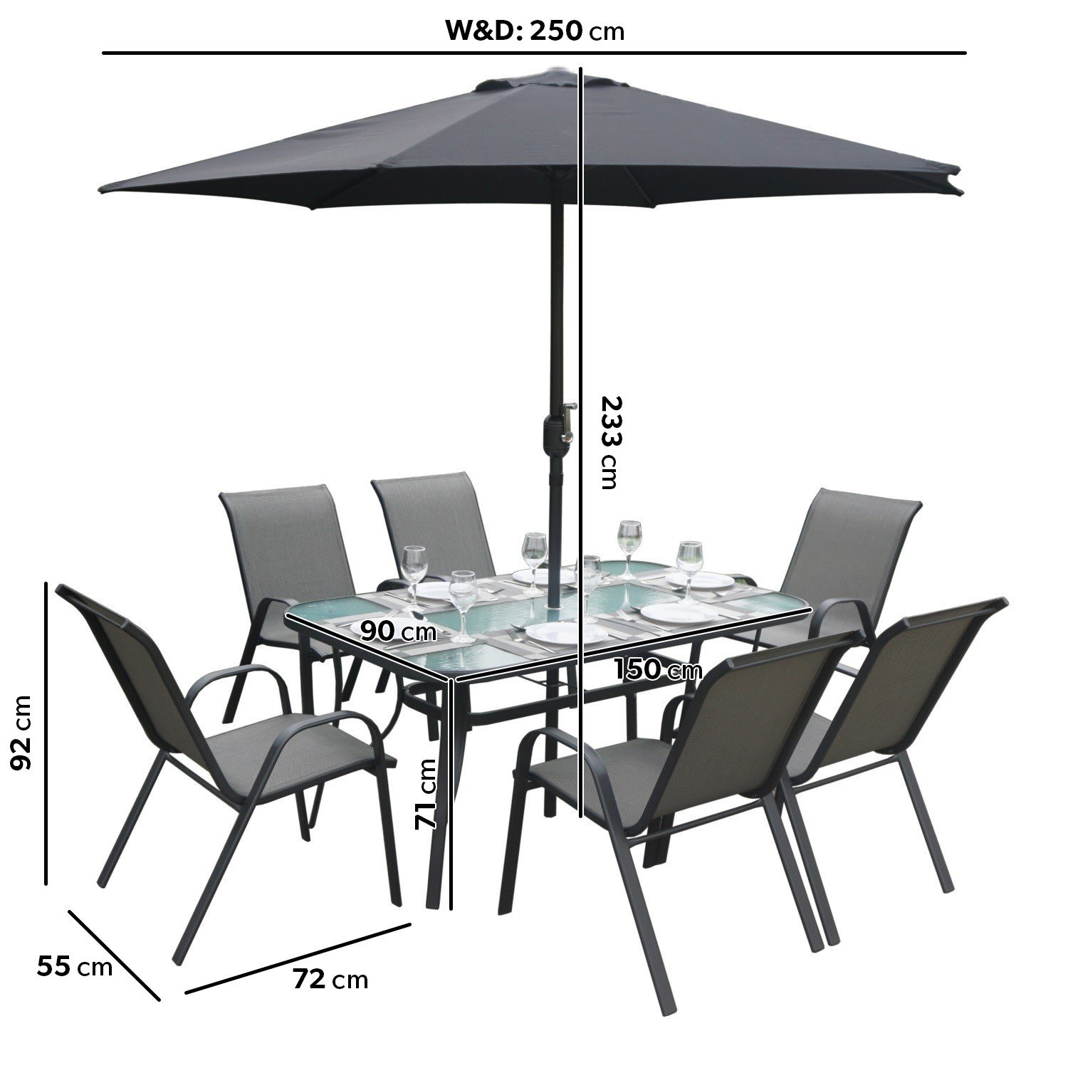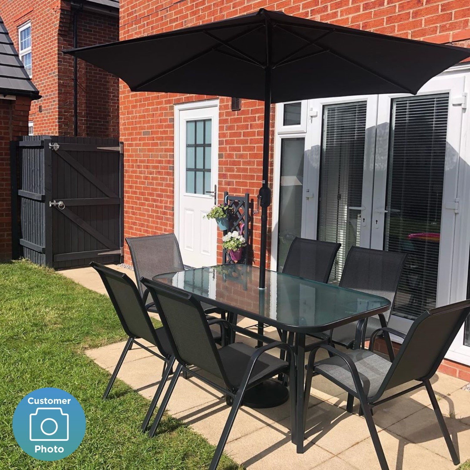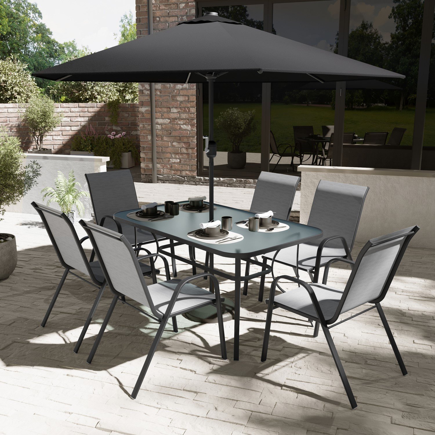 This summer, enjoy dining in your garden with our modern six-seater outdoor dining set. The stackable slingback chairs feature armrests to ensure that you’re comfortable whilst dining. The large table is great for entertaining family and friends on a warm summer’s day with an easy-to-clean glass table top. The set includes a free parasol with an easy crank mechanism to provide shade and even shelter from light showers. The parasol slots easily into the table’s central parasol hole and is secured by the base. With sturdy water-resistant steel frames, this dining set is a durable addition to your garden. It’s designed for use outdoors. However, we recommend that you store it indoors during winter or in one of our garden stores.