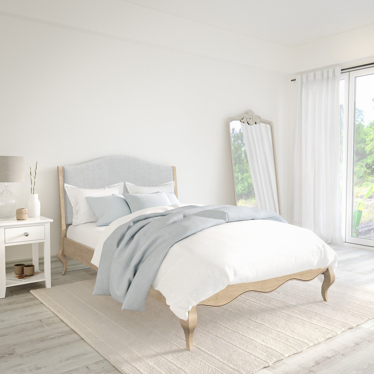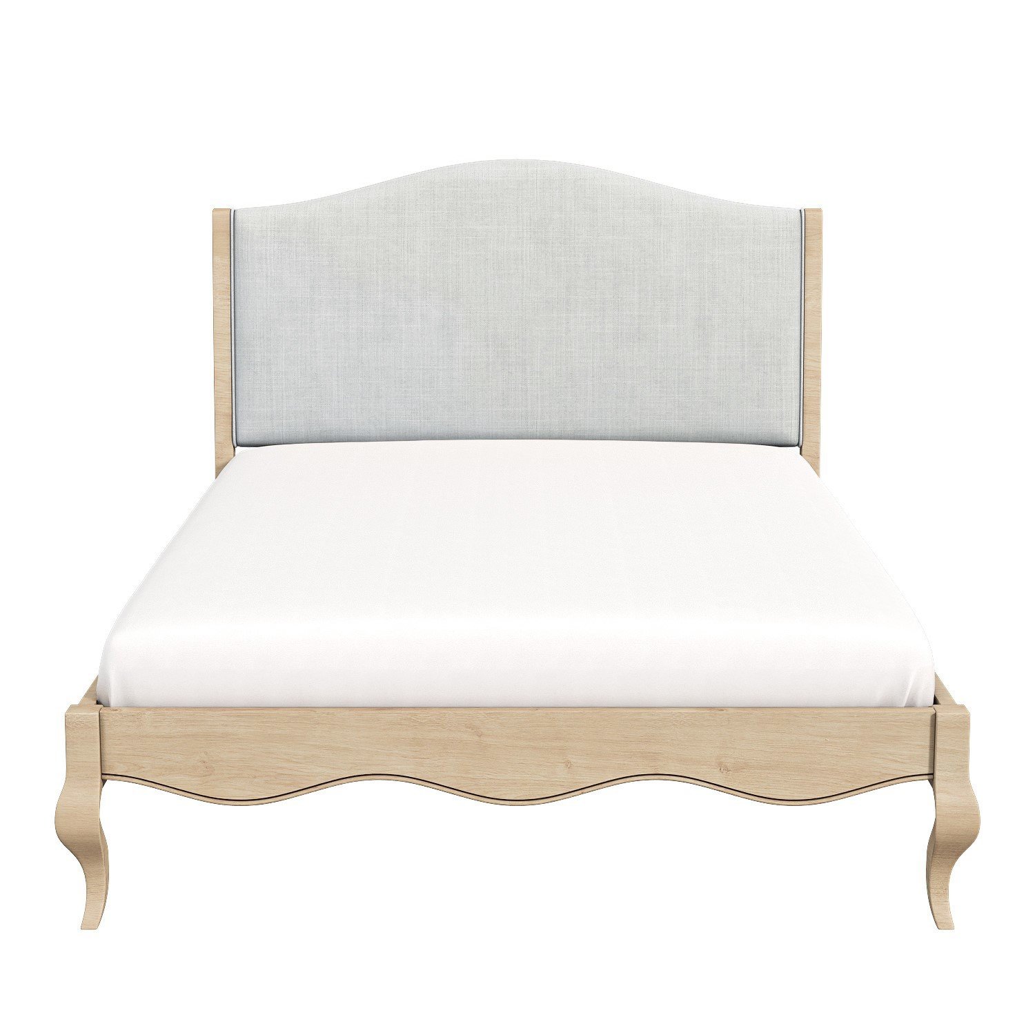 Add a touch of elegance to your bedroom with the Genevieve French-style bed frame with a woven linen fabric headboard. The limed-oak finish creates a washed effect, whilst the upholstered headboard adds a refreshing texture. The boutique blue headboard is perfect for the French style boudoir. This bed fits a standard UK king size mattress which is not included, but can be purchased separately.