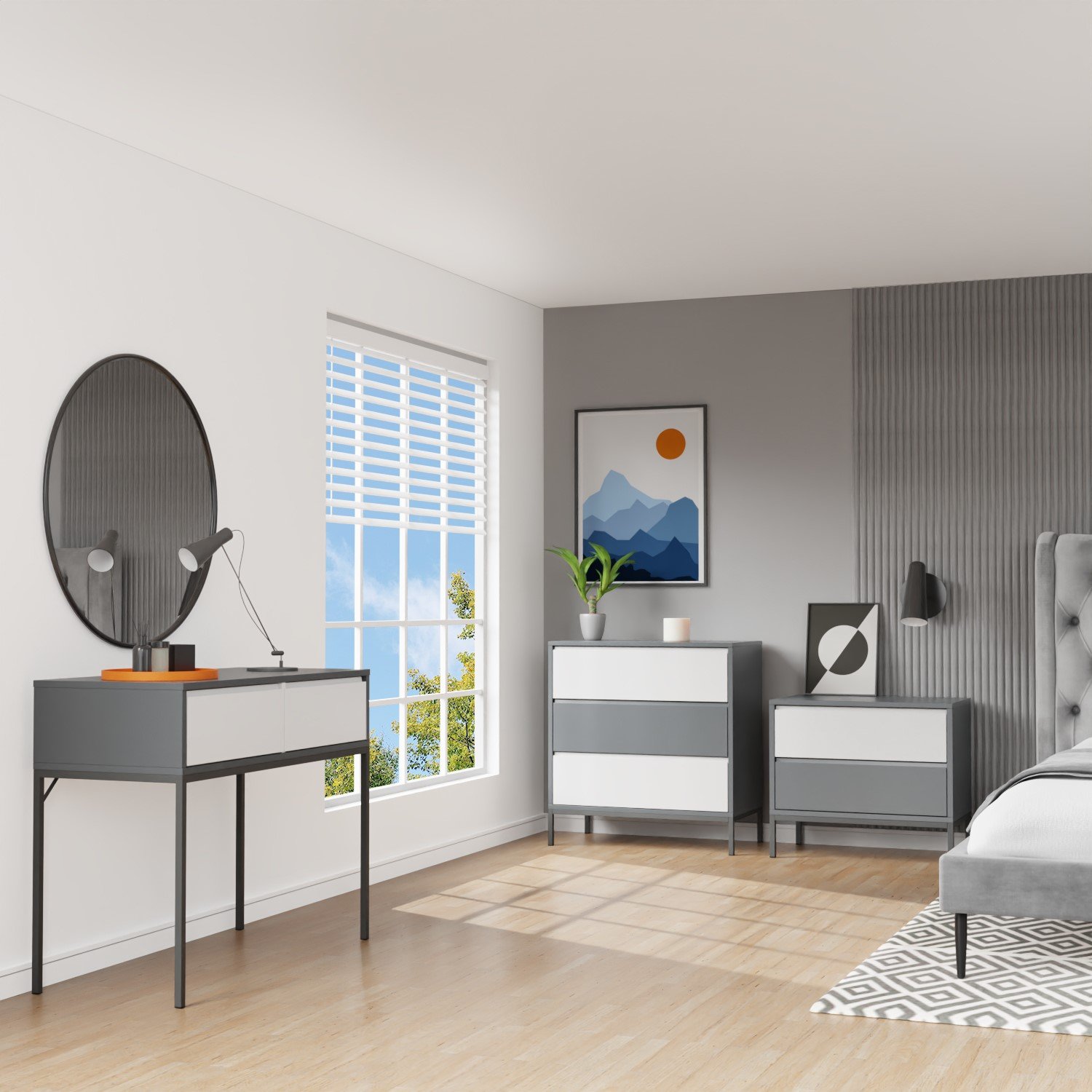 The Aiko retro dressing table makes a modern statement in any bedroom. With 2 large drawers for storing essentials and integrated handles, this piece add a practical and seamless look to your space. The two-tone grey design allows you to style it with many different colors and interior settings. Why not complete your room with the matching items?