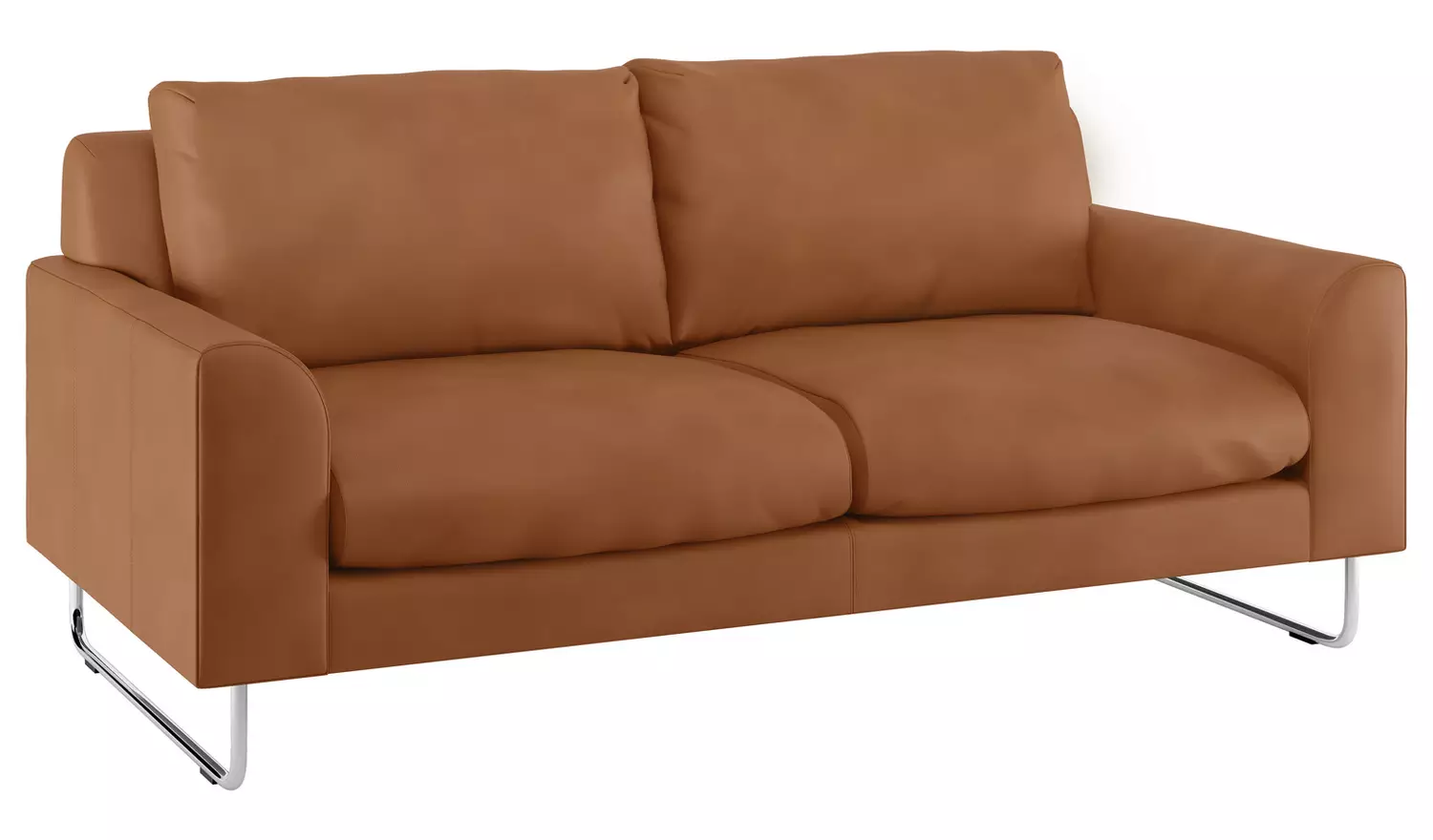 With squashy cushions and curved arms that soften its angular lines, the Lyle tan premium leather 2 seater sofa is a relaxed, contemporary design. Perched on chromed ski legs, the inviting sofa’s narrow frame allows a generous seat for its size; its cushions have a neat tucked detail on their corners and are removable for regular plumping. The sofa is hand made to order and is part of the Lyle range, available in various sizes with fabric or leather upholstery in a choice of colors.