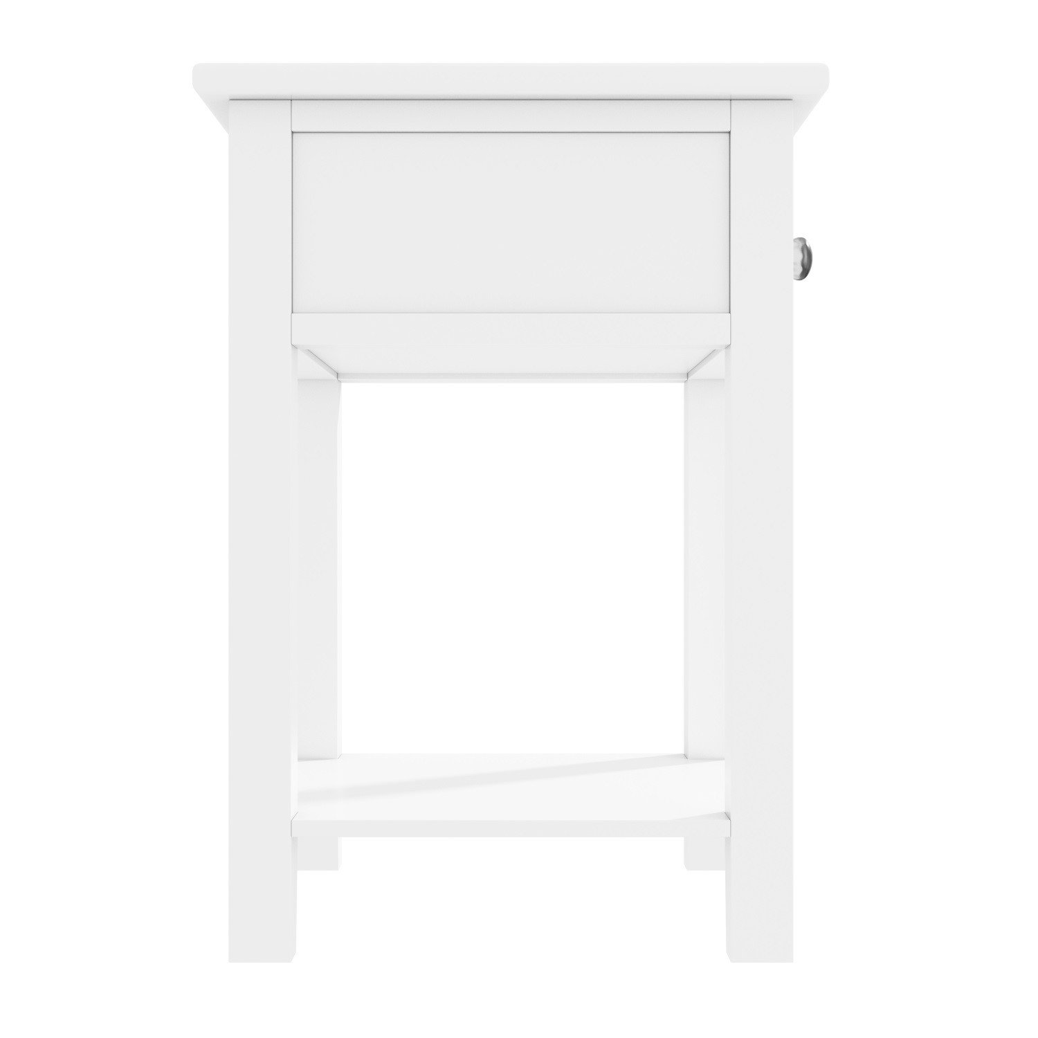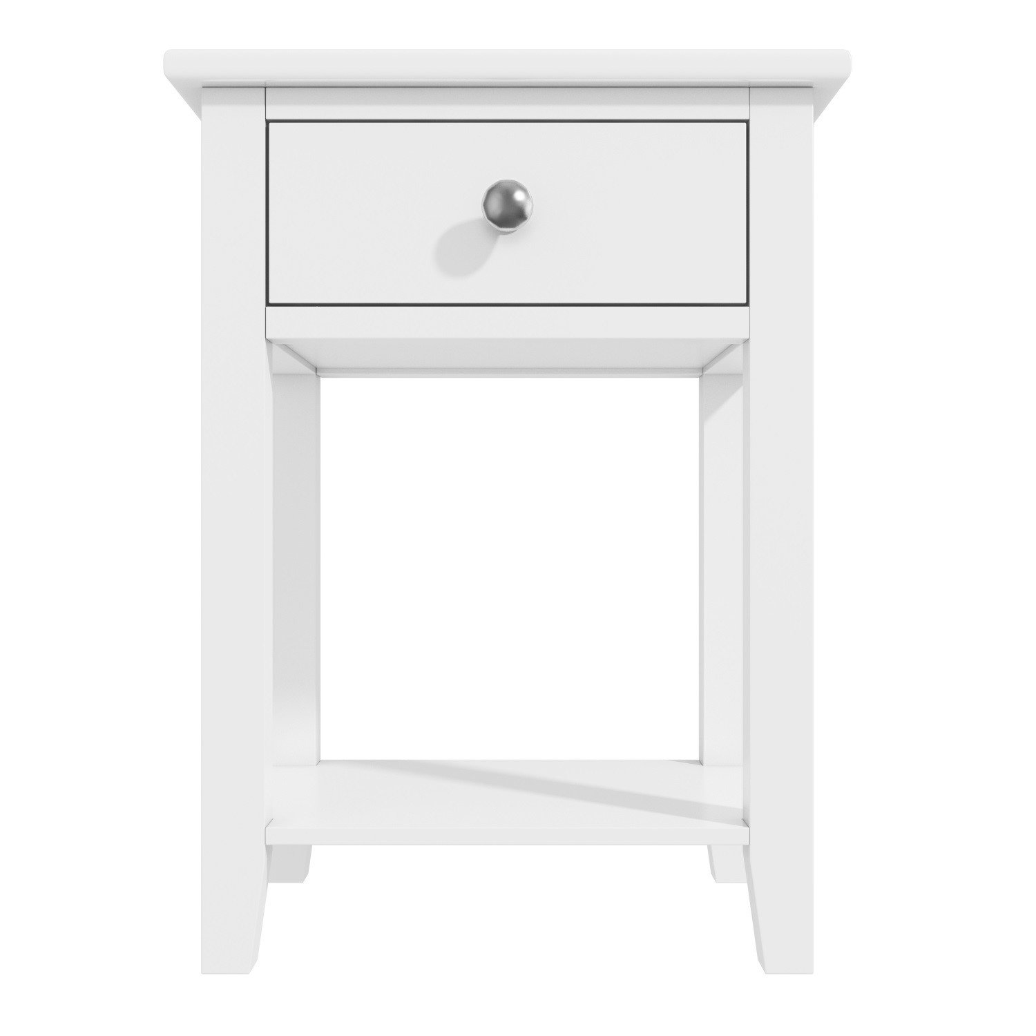 This neat bedside table is durable and visually appealing with its clean and classic aesthetic. It’s been crafted from solid wood with a fresh white painted and lacquered finish. It houses a single drawer and an open shelving space, giving ample storage for bedtime essentials. The drawer has durable wooden runners and has been finished beautifully with a simple knob handle in shiny chrome.